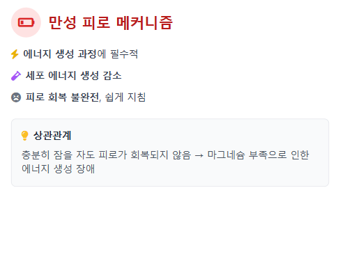 또한 충분히 잠을 자도 피로가 회복되지 않는 만성 피로 역시 마그네슘 부족현상의 대표적 신호입니다. 에너지 생성 과정에 마그네슘이 꼭 필요하기 때문에, 부족하면 세포가 충분한 에너지를 만들지 못하고 쉽게 지치게 됩니다.