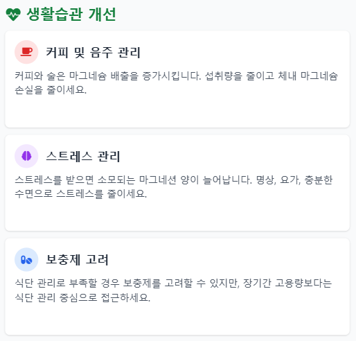 필요하다면 보충제를 고려할 수 있지만, 장기간 고용량 섭취보다는 식단 관리 중심으로 접근하는 것이 바람직합니다. 또한 커피, 음주, 스트레스 관리만 신경 써도 체내 마그네슘 손실을 상당 수준 줄일 수 있습니다.
